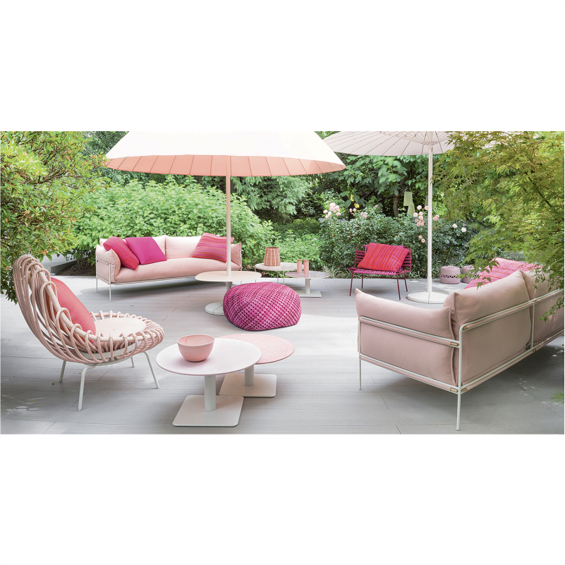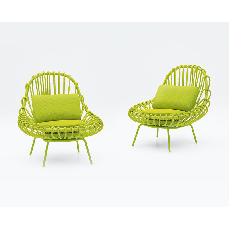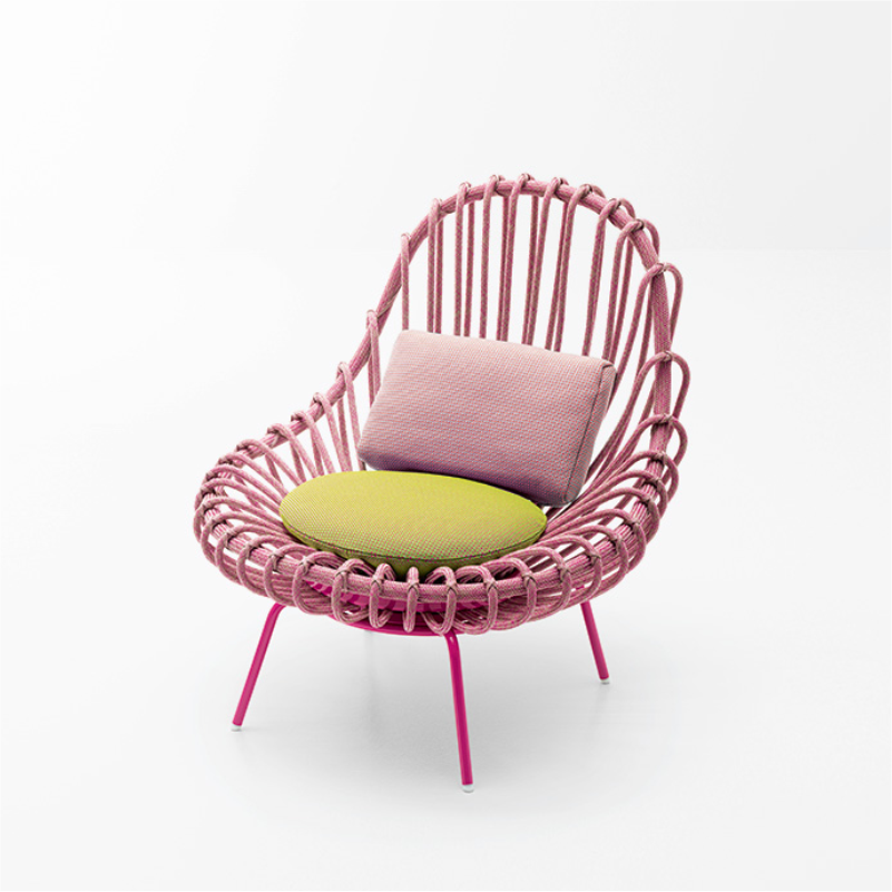 Giunco – tai elegantiškas krėslas iš lenkto aliuminio, rankomis apipintas Twiggy siūlais, kurie suteikia jam natūralumo ir tekstūrinio gylio. Nuimami sėdimosios ir atlošo pagalvėlių užvalkalai bei atsparios medžiagos leidžia mėgautis komfortu tiek lauke, tiek viduje.