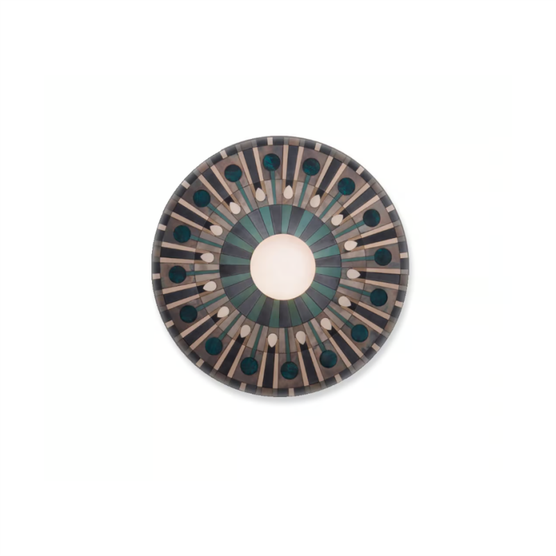 „Caleide Eon” – tai šviestuvas, kuriame šviesa ir metalas susilieja į polichrominę mozaiką, sukurtą iš oksiduoto ir šlifuoto plieno, žalvario bei vario. Centre esantis matinis stiklo rutulys skleidžia švelnią šviesą, kuri išryškina metalo tekstūras ir spalvų niuansus.