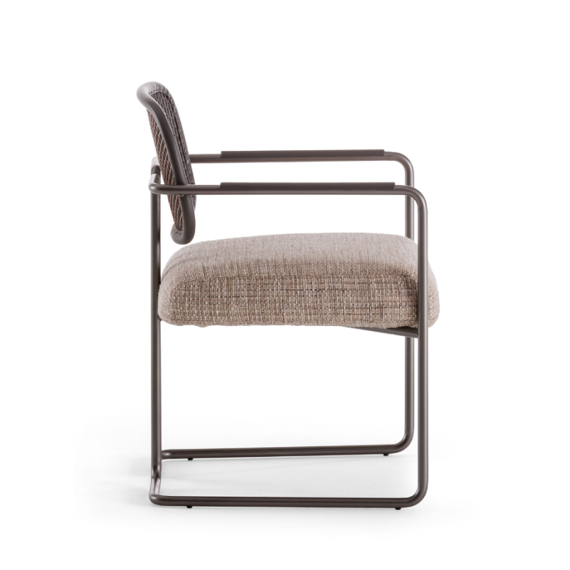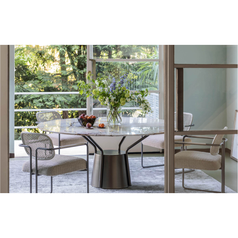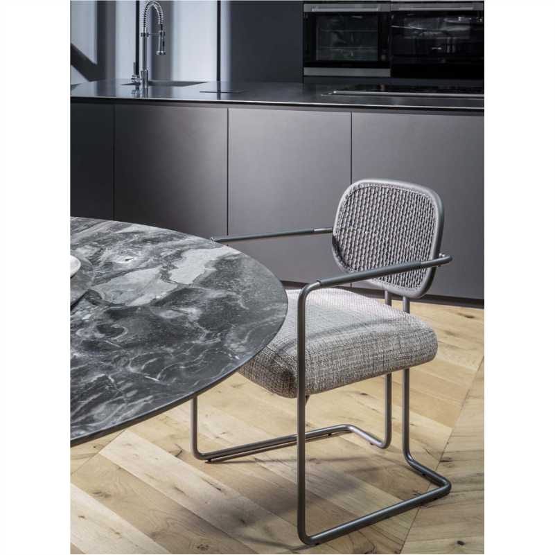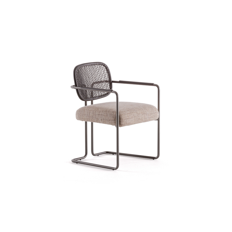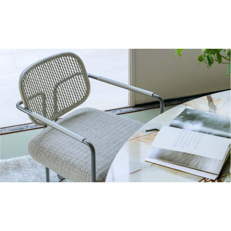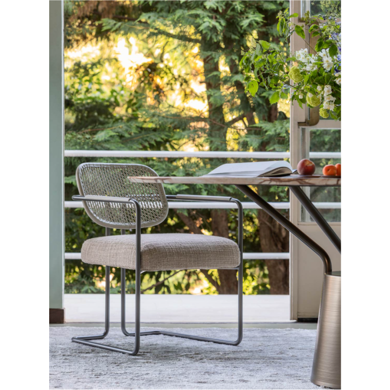„Arno“ kėdė sujungia lengvą išlenktą metalinę konstrukciją su prabangiu pintos odos atlošu. Jos dizainas įkvėptas senųjų Florencijos odos apdirbimo tradicijų, subtiliai perteiktų šiuolaikine forma.